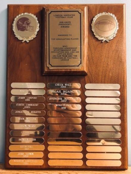 Awarded to the top graduating player who, through leadership, sportsmanship and dedication has, like Ian, left his mark on the Beefeaters & the Canadian Junior Football League. Ian, (pictured in his playing days) was a Beefeater player, coach and executive.